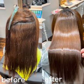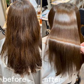 カラー毛×髪質改善で、髪がここまで美しくなれる! 色味は気に入っていても、毛先のパサつきや乾燥感が出やすいのがカラー毛の悩み。 今回は、ダメージ部分の反応をコントロールしながら 丁寧に髪の質感を整え、やわらかくまとまるストレートへ♪ ツヤ・手触り・まとまり。 すべてを底上げしてくれる、髪質改善ストレートの力をご体感ください。 |