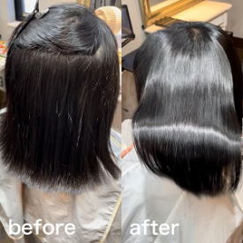 【Before→After】黒髪だからこそ、ツヤが命! パサつきと膨らみでまとまりづらかった黒髪さま。 乾燥で表面が広がり、ツヤも見えづらい状態でしたが… 髪内部にしっかり水分と柔軟性を補いながら、 自然な丸みのあるストレートへ♪ “黒髪の美しさ”を引き出すのは、やっぱりツヤと手触り。 ナチュラルで扱いやすい髪に仕上がりました! |